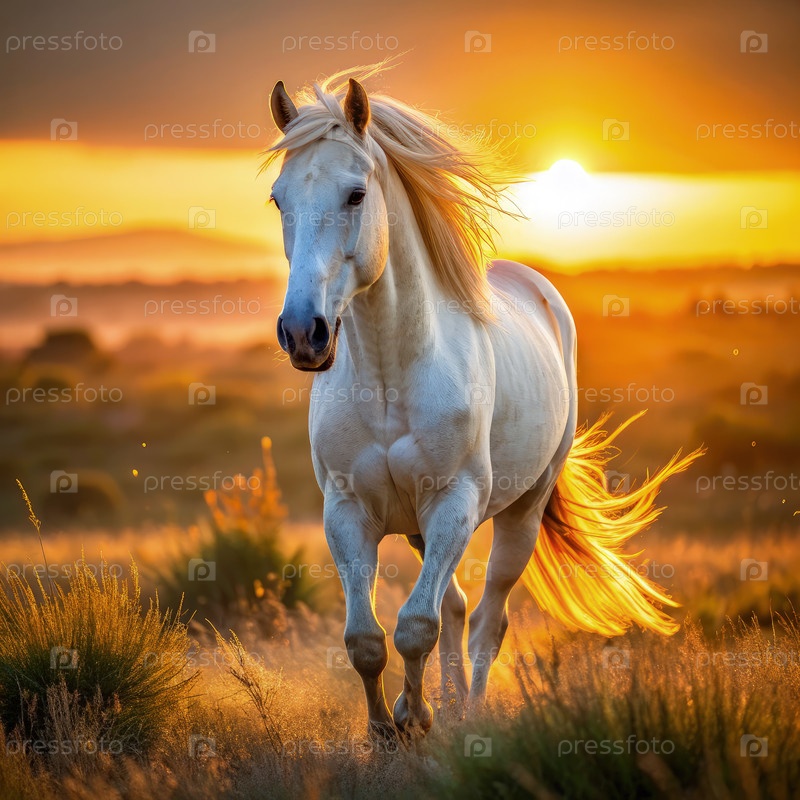 Дикая белая лошадь галопирует в золотое время на спокойном открытом ландшафте