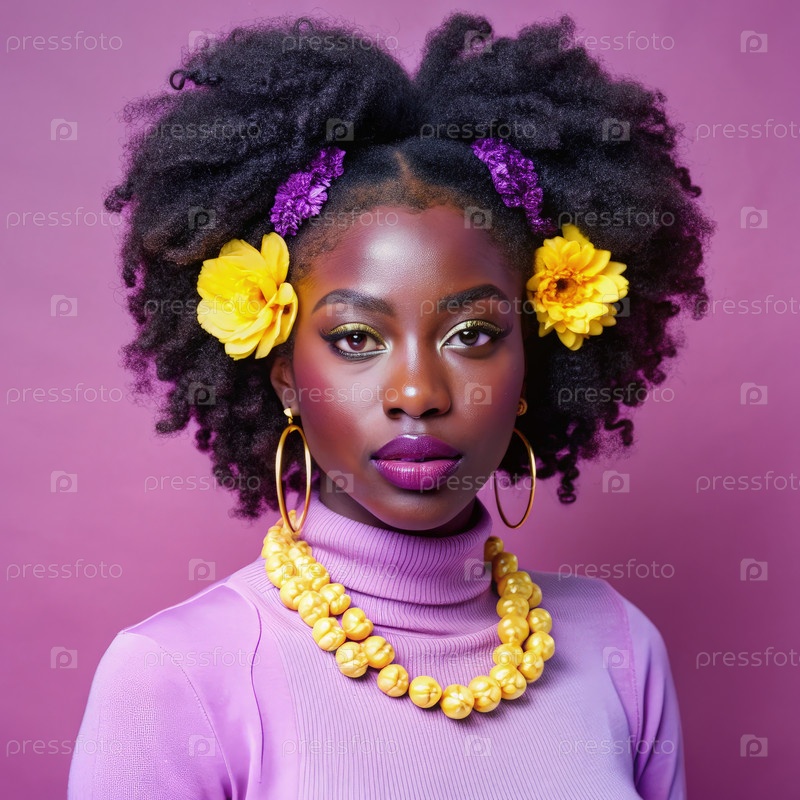 Женщина с естественной прической и цветами на фиолетовом фоне. генеративное искусство ИИ
