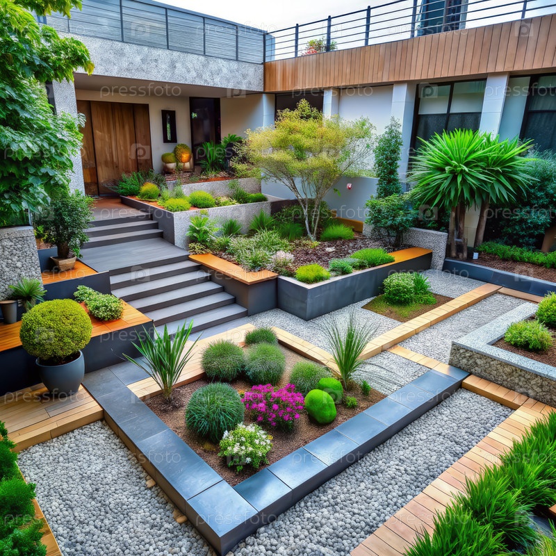 Современный дизайн сада с суккулентами и дорожками в современном доме