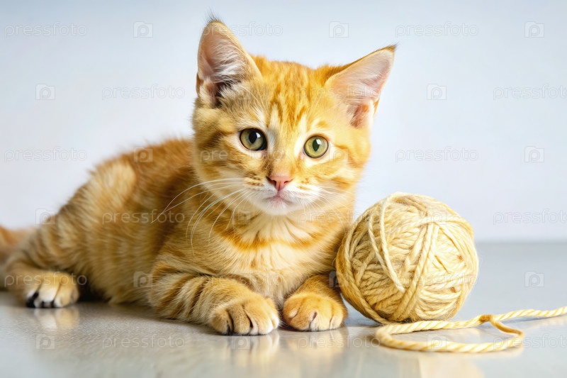 Игровой красный кот любит бить мяч из пряжи в яркой помещенной обстановке