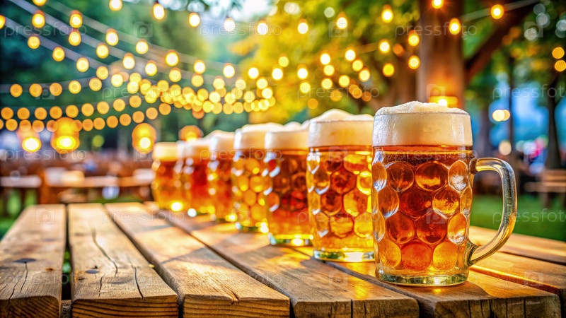 Живое собрание на открытом воздухе с пивными кружками, выстроившимися в ряд на деревянном столе, освещенном теплыми струновыми огнями во время праздничного вечера