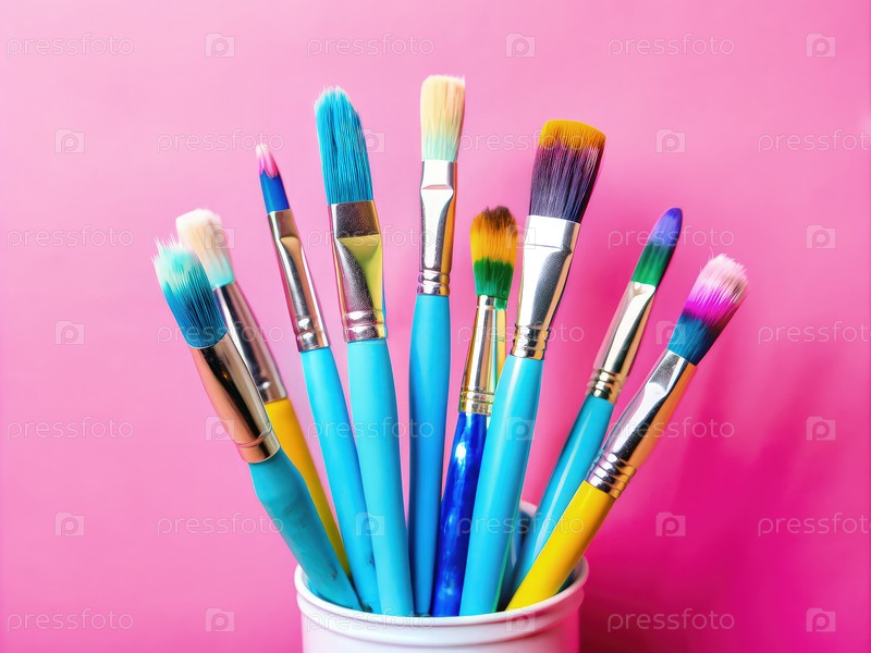 Коллекция красочных кистей, расположенных в чашке на ярко-розовом фоне, демонстрирует различные размеры и типы щеток, идеально подходящие для художественных проектов