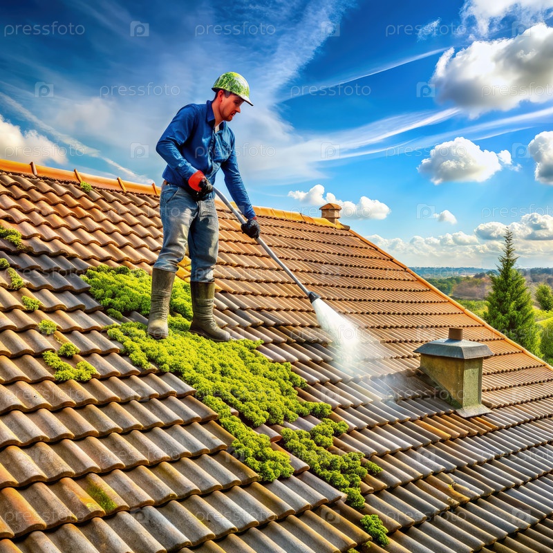 Работник убирает крышу дома с помощью нагнетательного инструмента под чистым голубым небом