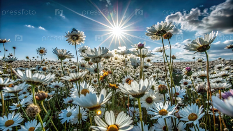 Живое поле сверкающих маргариток под ярким солнечным небом