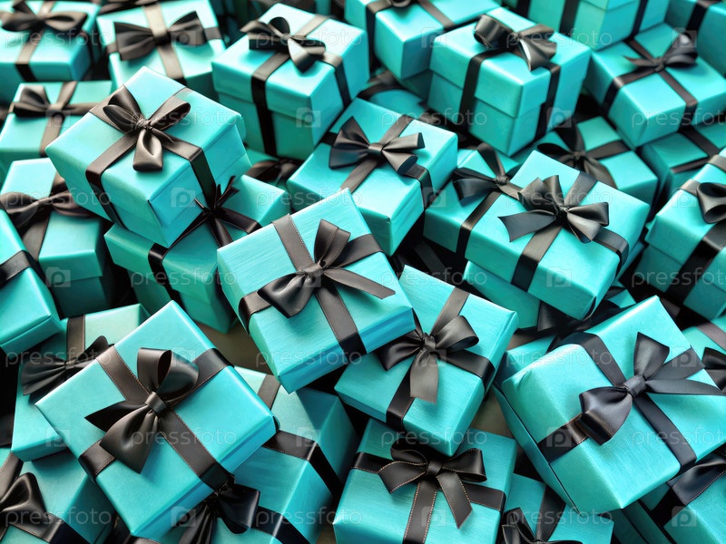 Яркая коллекция бирюзовых подарочных коробок с черными лентами, наложенными вместе