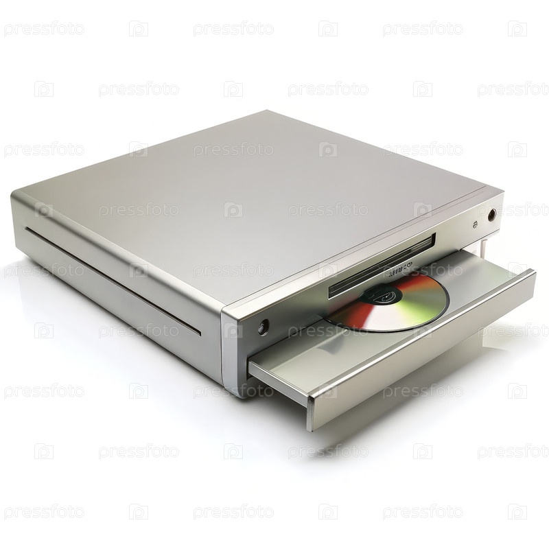 Компактный DVD-плеер с открытой подставкой и диском на белом фоне