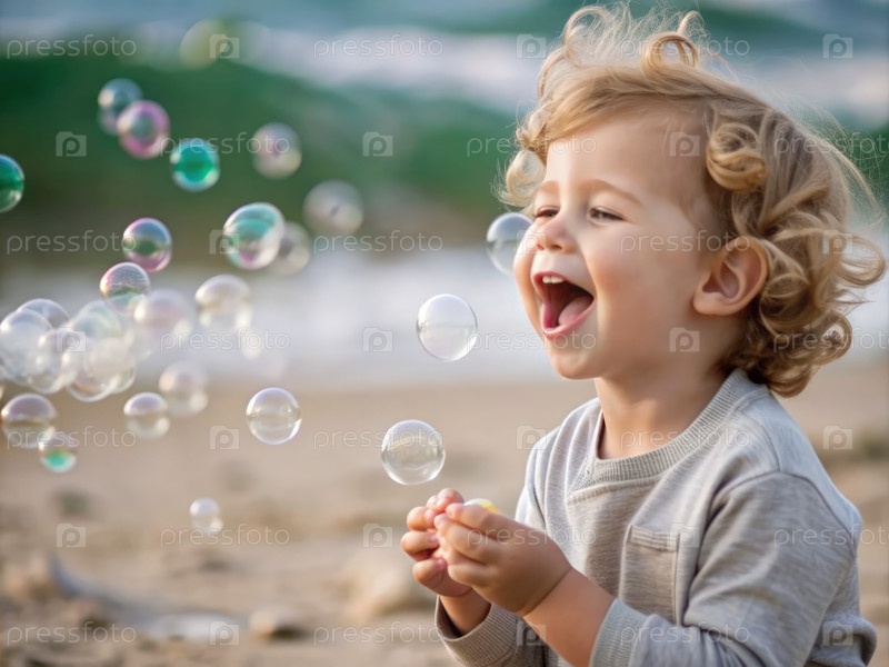 Веселый ребенок, играющий с пузырями на пляже в солнечный день