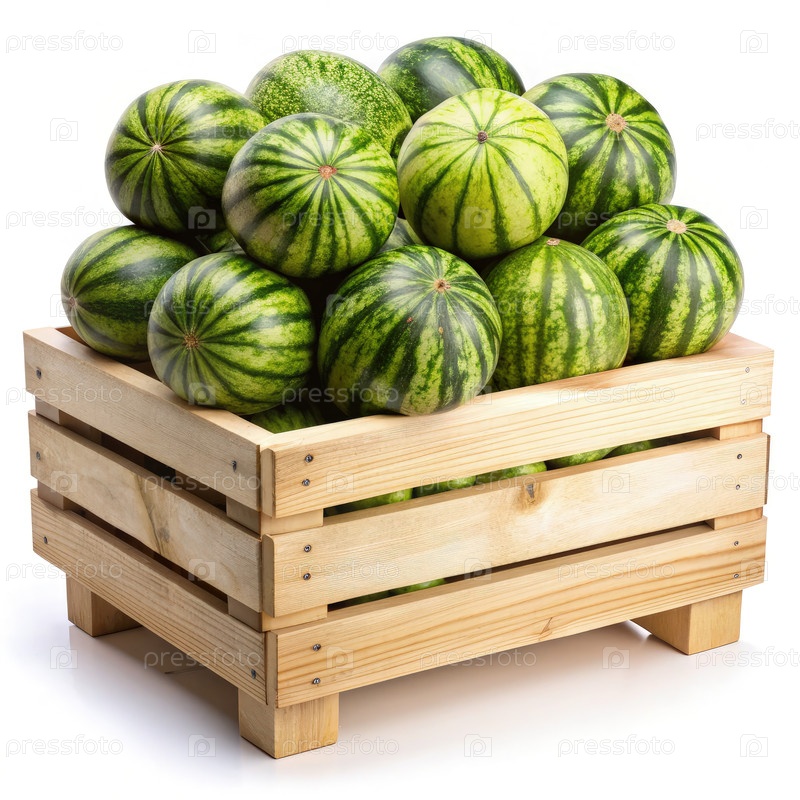 Деревянная коробка, заполненная свежими арбузами на белом фоне