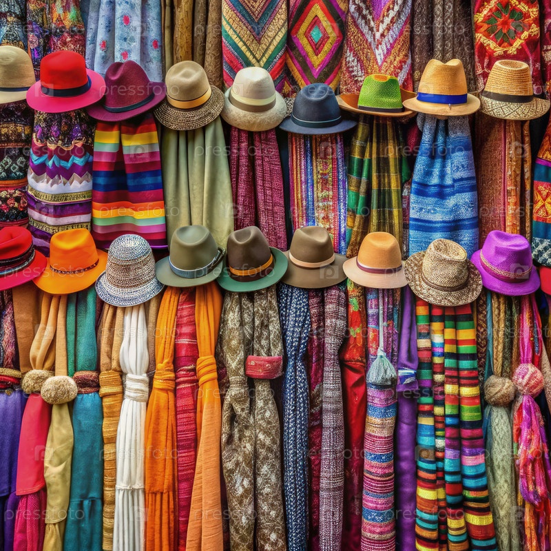 Красочные текстильные изделия и шляпы выставлены на оживленном рынке