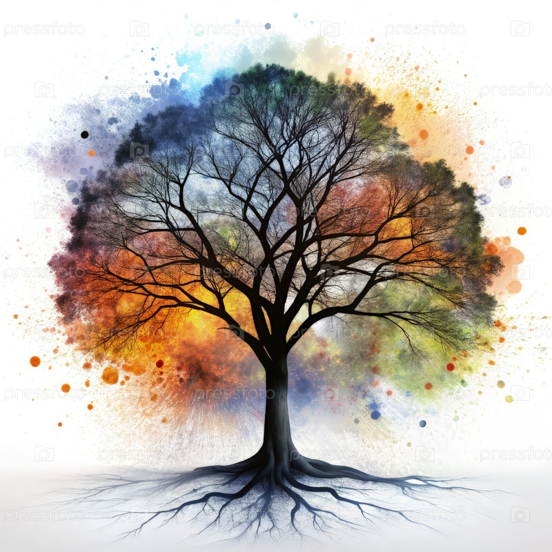 Абстрактное произведение искусства черного дерева, окруженное красочными пятнами на белом фоне
