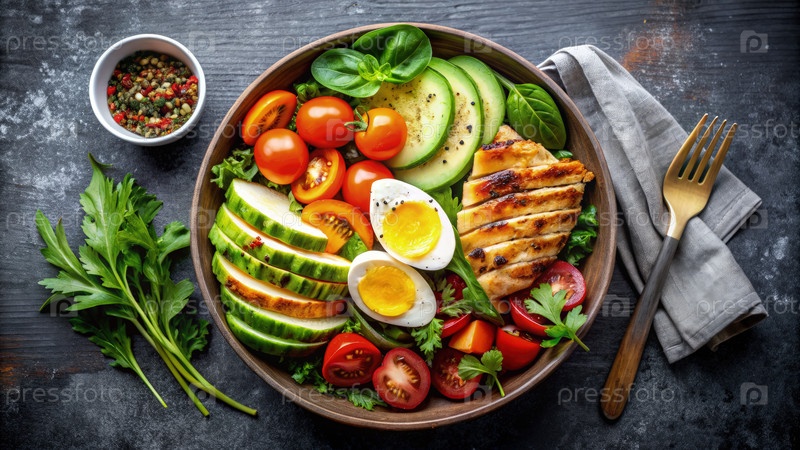 Здоровая салатная миска с жареной курицей, свежими овощами и вареными яйцами, подаваемыми на обед