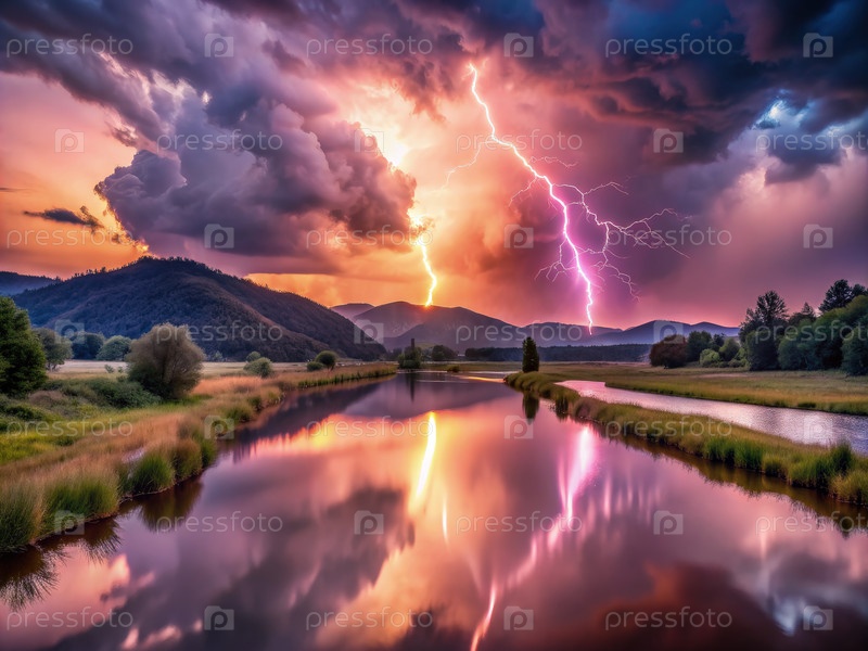 Драматическая молния освещает небо над спокойной рекой в сумерки
