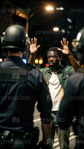 Мужчина с поднятыми руками пытается объяснить свою точку зрения во время напряженной встречи с полицией на улице города ночью