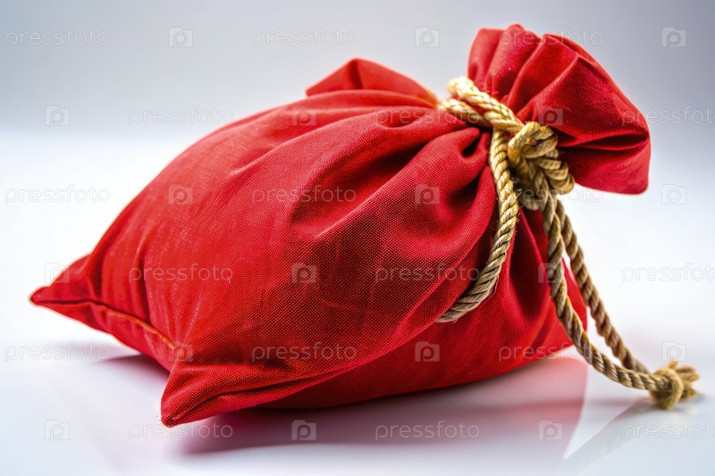 Красный мешок с золотой веревкой, лежащий на гладкой поверхности ткани студии