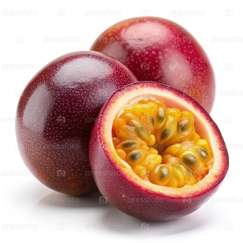 Свежие страстные плоды изолированы на белом фоне с яркими цветами