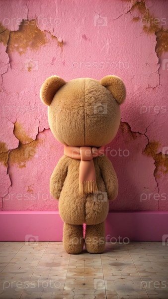 Очаровательный тедди-медведь чиби с карамельной шерстью и розовым шарфом на винтажной розовой стене. генеративный AI