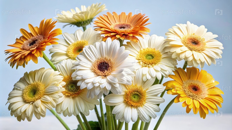 Яркие герберы, расположенные в вазе на светло-синем фоне