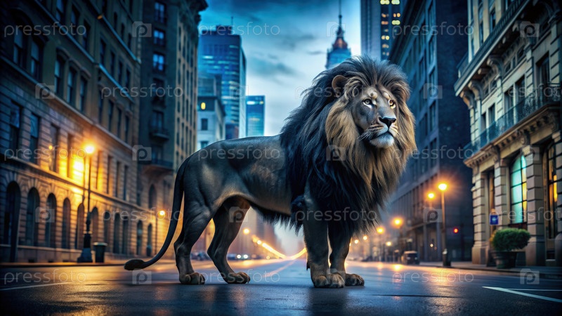 Величественный черный лев бродит по тихим улицам города под лунным светом в оживленной городской обстановке ночью