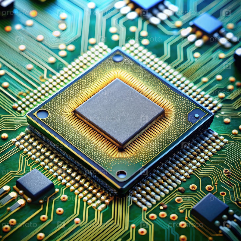 Ближайшее изображение электронного микрочипа на плате схемы под студийным освещением