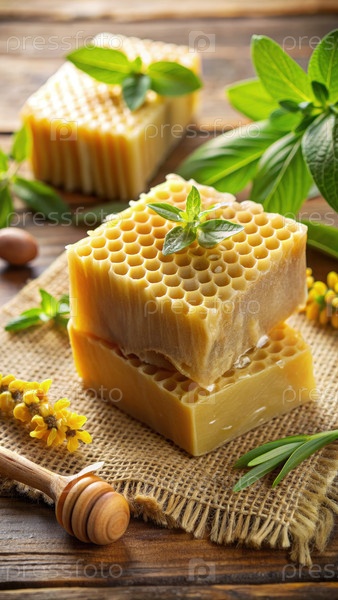 Блоки натурального медного мыла, отображаемые на деревянной поверхности, окруженные зелеными травами и медом, идеально подходят для любителей экологически чистых средств по уходу за кожей