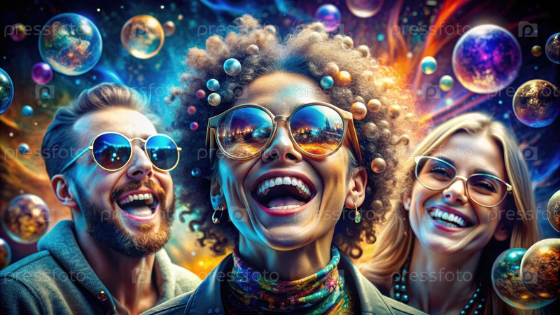 Радостная группа друзей наслаждается космическим опытом в красочной Вселенной