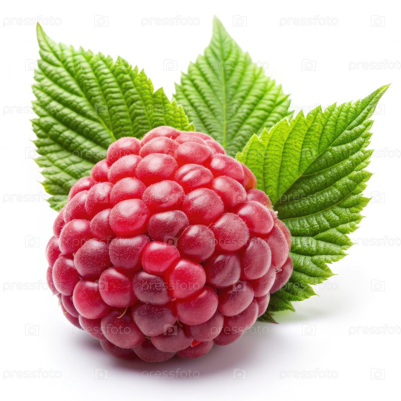 Зрелая красная малина с зелеными листьями на белом фоне