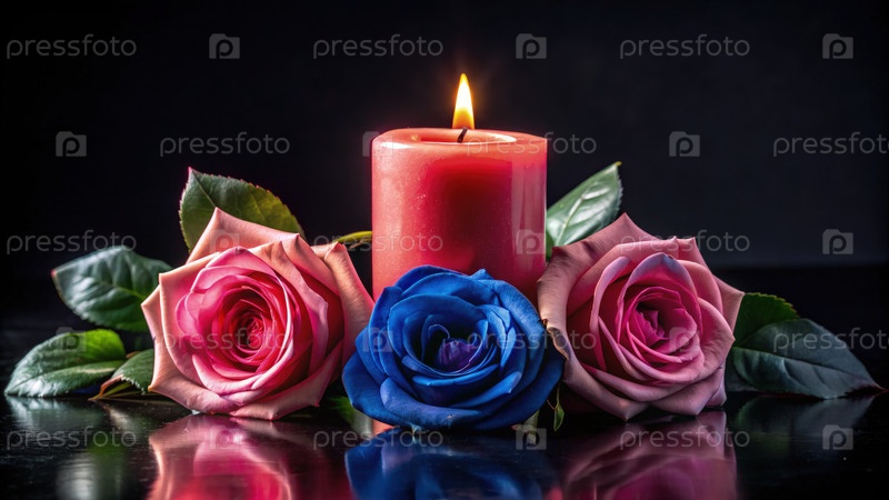 Впечатляющая композиция розовых роз и красной свечи на отражающей поверхности