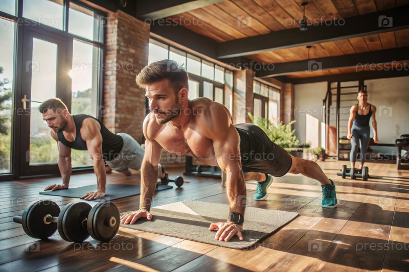 Утренняя тренировка в тренажерном зале с тяжелыми весами и отжимами
