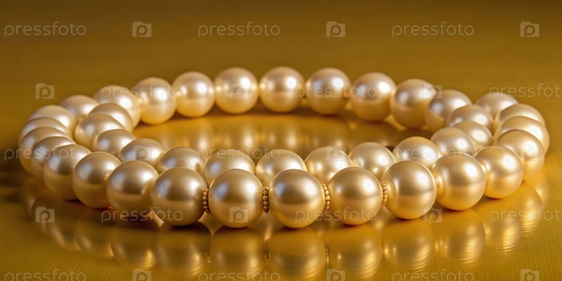 Светящееся белое жемчужное ожерелье, изящно выставленное на золотой поверхности