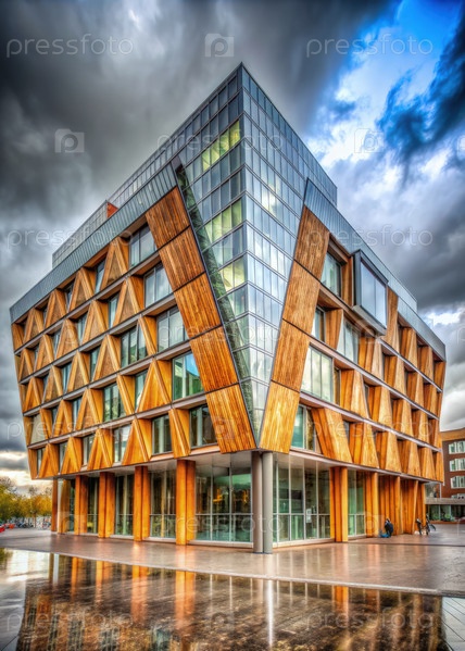 Архитектурный дизайн имеет уникальные деревянные акценты под облачным небом