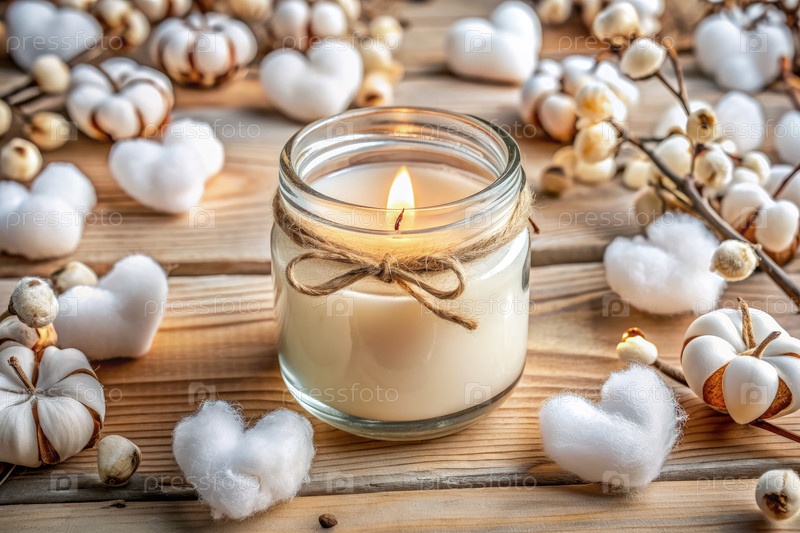 Свеча в стеклянной банке, окруженная цветками хлопка на деревянной поверхности