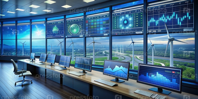 Высокотехнологичная диспетчерская комната с прозрачными экранами, отслеживающая системы возобновляемой энергетики и показатели производительности в течение дня
