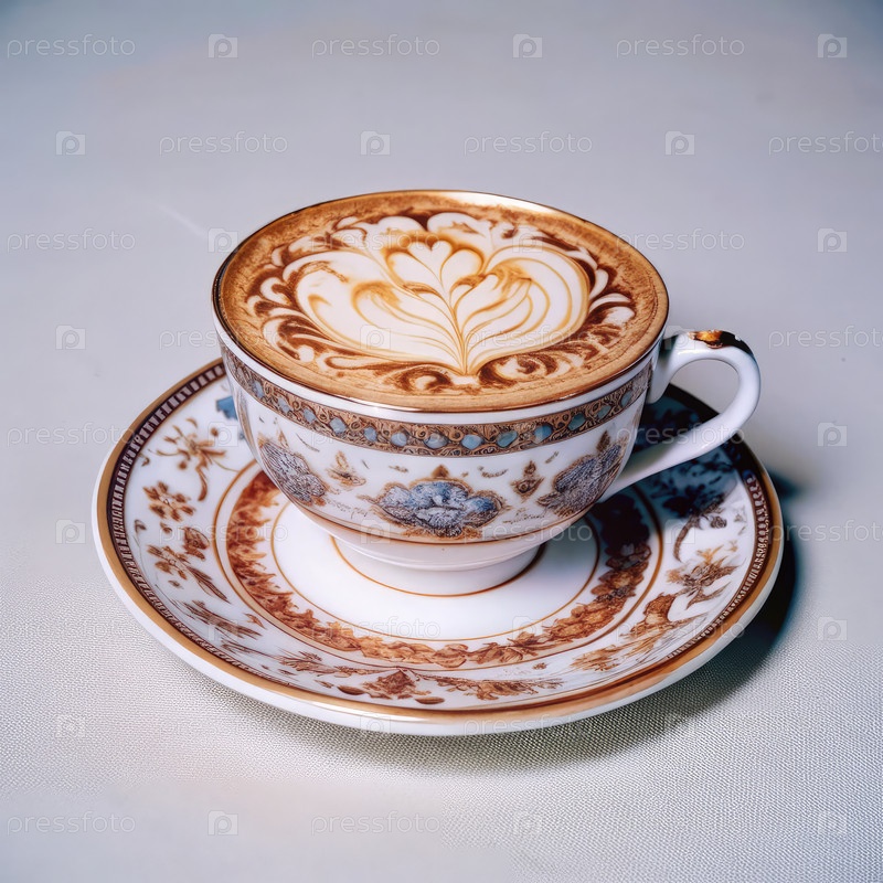Красиво выполненное капучино изящно сидит на декоративной тарелке на темном фоне, подчеркивая его богатые цвета и тонкое искусство латте