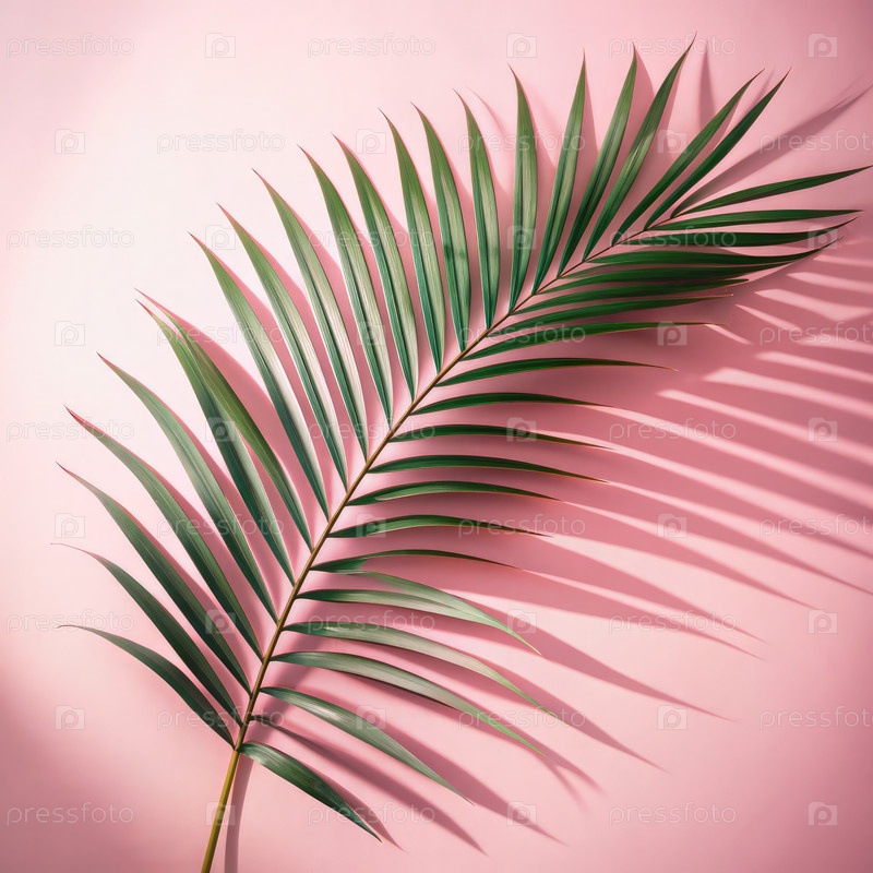 Листья тропических пальмовых деревьев бросают тени на пастельно-розовом фоне