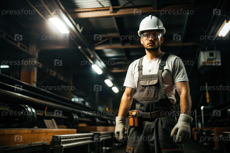 Работник в защитном снаряжении уверенно стоит на слабо освещенном промышленном объекте