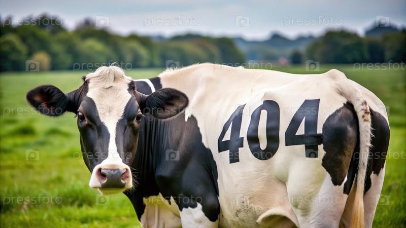 Черно-белая корова со стандартным номером Ошибка 404 гордо стоит в пышном зеленом поле под облачным небом поздним днем