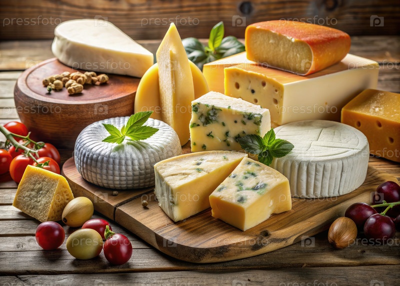 Разнообразные сыры, отображаемые на деревянной доске с свежими овощами и травами