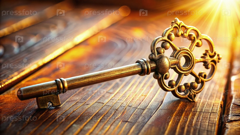 Винтажный декоративный ключ, опирающийся на деревянную поверхность с сияющим солнечным светом