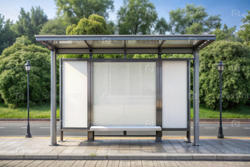 Пустая рекламная панель в приюте на автобусной остановке, окруженной зеленью в ясный день в пригороде