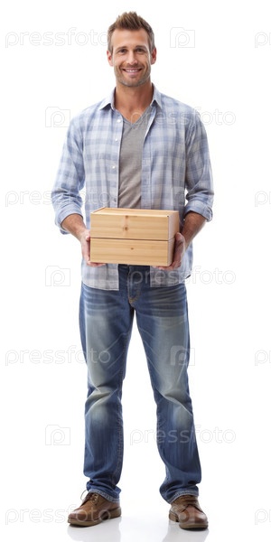 Случайный изолированный белый мужчина, держащий деревянную коробку, в то время как днем он носит клетчатую рубашку и джинсы в помещении