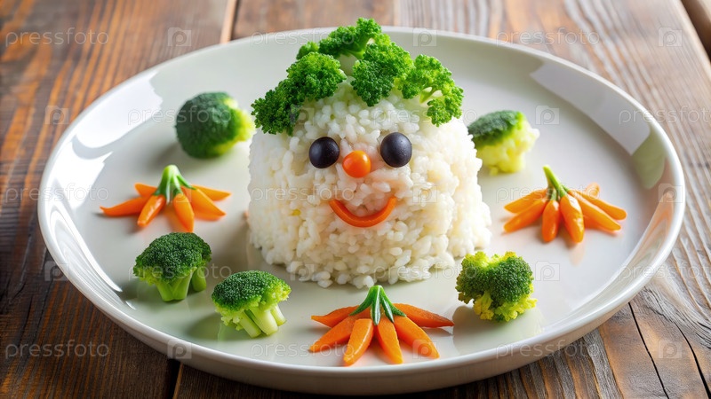 Характер риса Уте с брокколи и морковью на белой тарелке