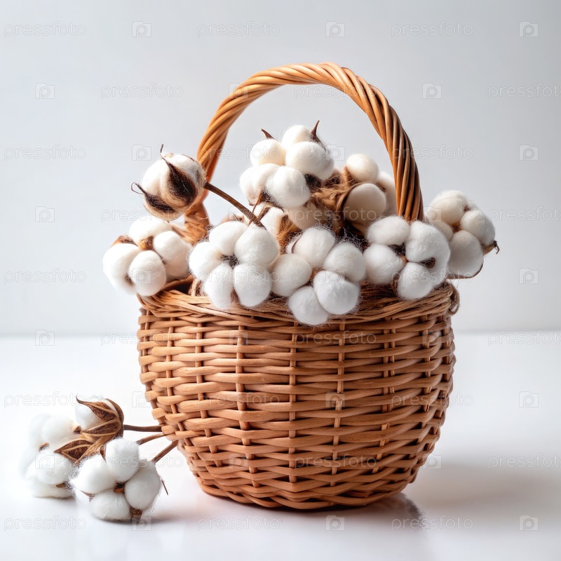 Простая плетеновая корзина, наполненная пышными цветами хлопкового растения на чистом белом фоне, демонстрирующая красоту и простоту природы