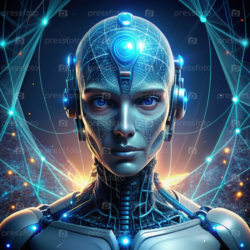 Футуристический гуманоидный робот со светящимися схемами и нейронными связями