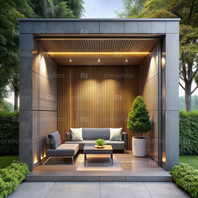 Современная наружная ниша с сиденьями и зеленой средой в спокойной обстановке