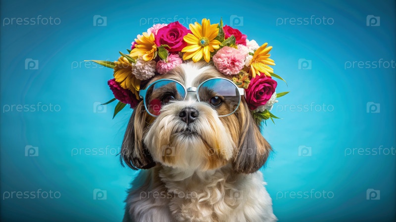 Собака Шицзу носит солнцезащитные очки и цветочную корону на ярком фоне