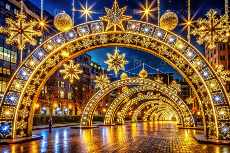 Впечатляющий рождественский городской дисплей с освещенными арками, украшенными звездами и орнаментами в яркой городской обстановке во время праздничного сезона