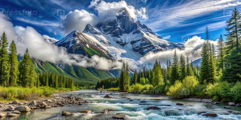 Снежный горный ландшафт имеет высокие скалистые вершины, текущую реку и пышную зелень, демонстрируя красоту природы в ярком дневном свете