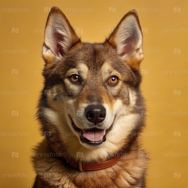 Близкий план улыбающейся собаки с теплым мехом на желтом фоне