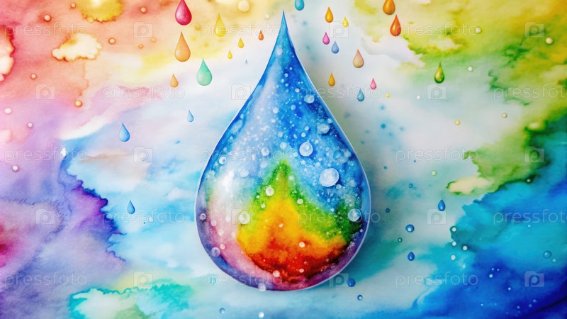 Путешествие капли дождя через красочные водные пейзажи в яркой акварели