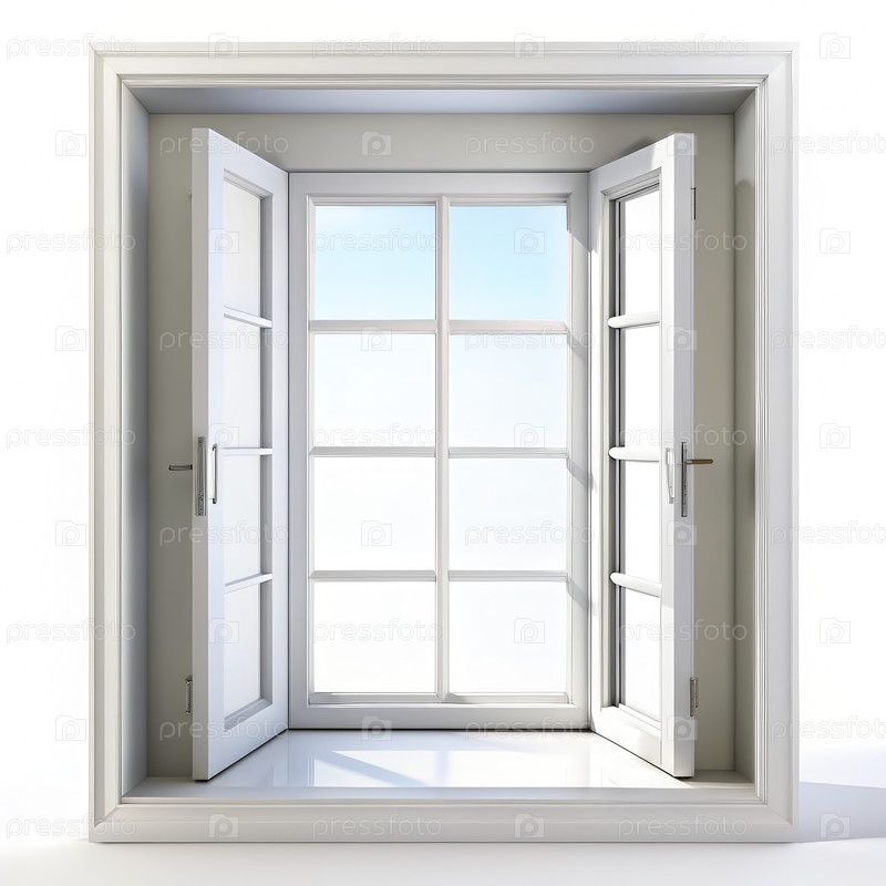 Ярко белое окно с открытыми жалюзи, приветствующее естественный свет в ясный день